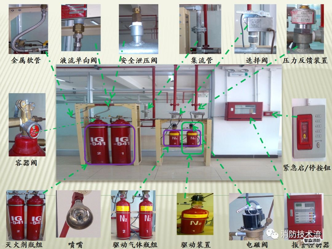 滅火劑瓶組、容器閥、單向閥、集流管、安全泄壓閥、選擇閥、驅(qū)動(dòng)裝置、驅(qū)動(dòng)氣體瓶組、壓力反饋裝置、噴頭、火災(zāi)報(bào)警控制器、噴嘴、管道管件及吊鉤支架等部件組成。
