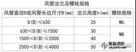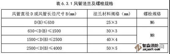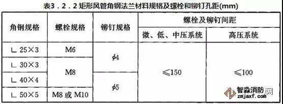 二、金屬風(fēng)管采用法蘭連接時(shí),法蘭材料規(guī)格應(yīng)按《建筑防煙排煙系統(tǒng)技術(shù)標(biāo)準(zhǔn)》表6.3.1選用,風(fēng)管接口的連接應(yīng)嚴(yán)密、牢固,法蘭墊片應(yīng)為不燃材料(A級(jí)),厚度不應(yīng)小于3mm,不應(yīng)凸入管內(nèi)和法蘭外。螺栓孔的間距不得大于150mm,矩形風(fēng)管法蘭四角處應(yīng)設(shè)有螺孔。(6.3.1