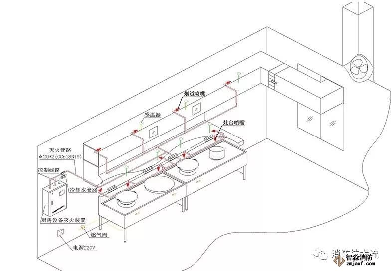 固定安裝于公共廚房等高濕熱環(huán)境中,由滅火劑貯存容器組件、驅(qū)動氣體貯存容器組件、管路、噴嘴、閥門及其驅(qū)動裝置、感溫器、控制裝置、燃料閥等組成,能在發(fā)生火災(zāi)時自動探測并實施滅火的成套裝置。