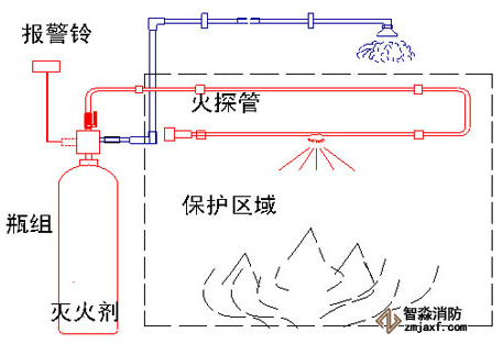 間接式:火探管與滅火介質(zhì)容器閥連接,延伸進入保護空間,進行火源探測,遇火時火探管爆破,火探管中的壓力下降,發(fā)出報警信號,啟動容器閥,通過專設(shè)的釋放管及噴嘴把滅火劑釋放出來,實現(xiàn)滅火。間接式適用于滅火空間較大的場所。