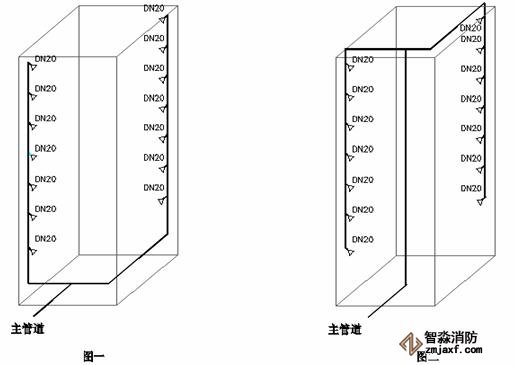 2.2 對封閉式豎向立體車庫在設(shè)計主管道進口時應(yīng)該采用圖一的方式,但大多設(shè)計院采用的是圖二的方式進管。
