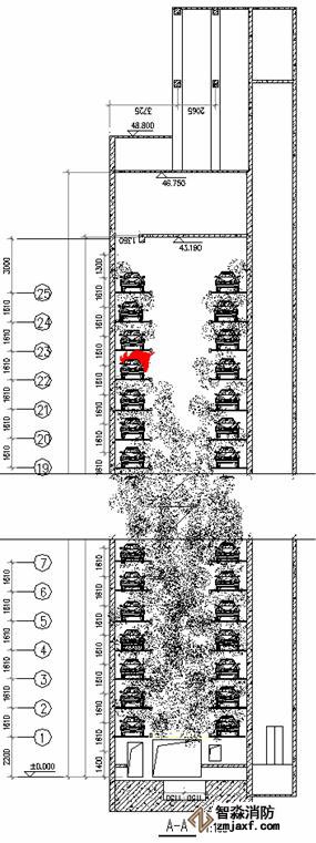 2.1 立體停車庫設(shè)置二氧化碳氣體滅火系統(tǒng)在《汽車庫、修車庫、停車場設(shè)計防火規(guī)范》中已有相應(yīng)規(guī)定,由于立體停車庫是一個獨立的大空間,采用全淹沒單元獨立方式滅火是最為理想的,設(shè)置高壓系統(tǒng)而不設(shè)置低壓系統(tǒng)原因有二:其一、低壓系統(tǒng)壓力太小,要爬升到40多米高度再往下噴放藥劑顯然壓力不足;其二、低壓系統(tǒng)的大型儲罐只能放在一樓或二樓,這樣有利于日后補充藥劑,若為保證壓力而把儲罐放的太高,二氧化碳槽車根本無法靠近,充裝藥劑就很難實現(xiàn)。