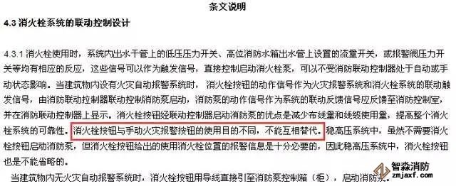 至于手報和消火栓按鈕能不能互相替代的問題,答案是明確的,消火栓按鈕與手動火災(zāi)報警按鈕的使用目的不同,不能互相替代。在GB50116-2013《火災(zāi)自動報警系統(tǒng)設(shè)計規(guī)范》4.3消火栓系統(tǒng)的聯(lián)動控制設(shè)計的條目說明中有原文“消火栓按鈕與手動火災(zāi)報警按鈕的使用目的不同,不能互相替代。”,如下圖。