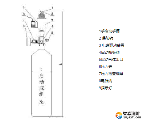 IG541混合氣體啟動瓶組由貯存鋼瓶、瓶頭閥、壓力表、電磁驅動裝置(帶手啟動手 柄及保險銷)組成,瓶內充裝氮氣(N2),作為驅動氣體。瓶組容積有4L、7L、40L三種規(guī)格。4L、7L有標準的瓶組架,40L可安裝于滅火劑瓶組架 兩側,也可定制瓶組架。啟動瓶組有自動和應急操作兩種啟動方式。自動啟動受來自火災自動報警控制器的控制,電磁驅動裝置動作,啟動瓶組開啟,實現(xiàn)自動啟 動。若自動啟動失靈或無法實現(xiàn),需進行機械應急操作,拔下電磁驅動裝置上保險銷(見圖),用手按下手啟動手柄(見圖),啟動瓶組開啟,實現(xiàn)應急操作啟動。 啟動瓶組的壓力表后部有檢測壓力的螺母,在檢測啟動瓶組壓力時,用扳手按逆時針方向旋轉螺母至壓力顯示,檢測完畢后,按順時針方向旋緊,然后逆時針旋松壓 力表,放掉壓力表內氣壓,使指針回零,再把壓力表復位。